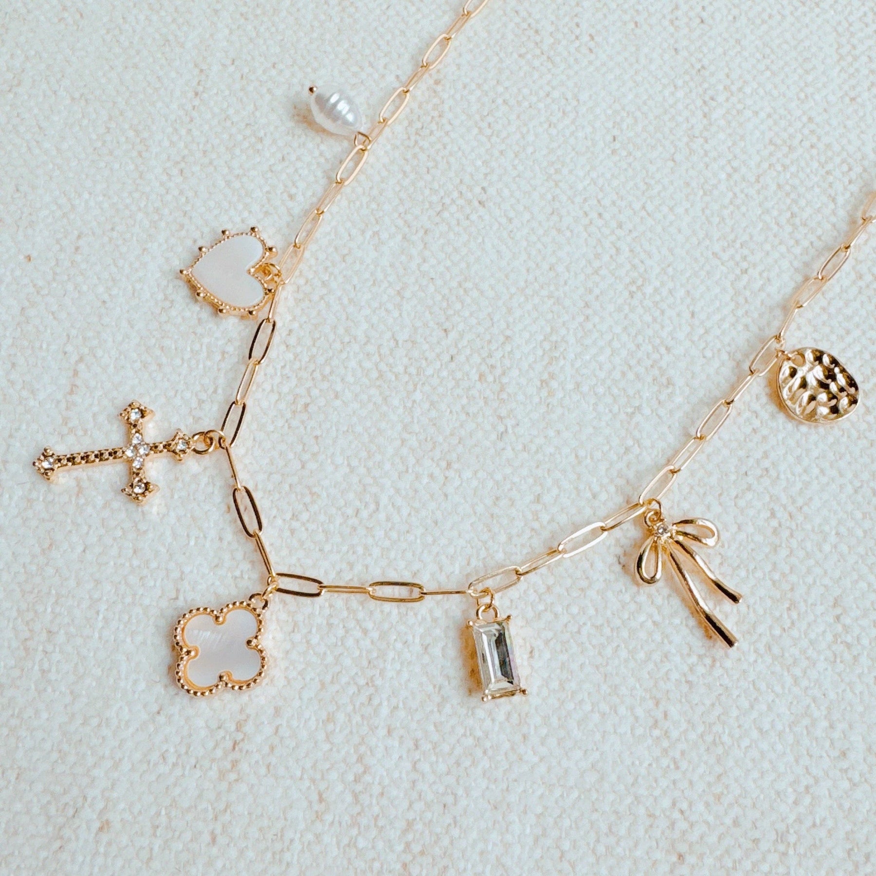 This versatile charm necklace features a modern and chic cross and clover design. Perfect for any occasion, it adds a touch of sophistication to any outfit. With its versatile design, it can be worn with both casual and formal attire.