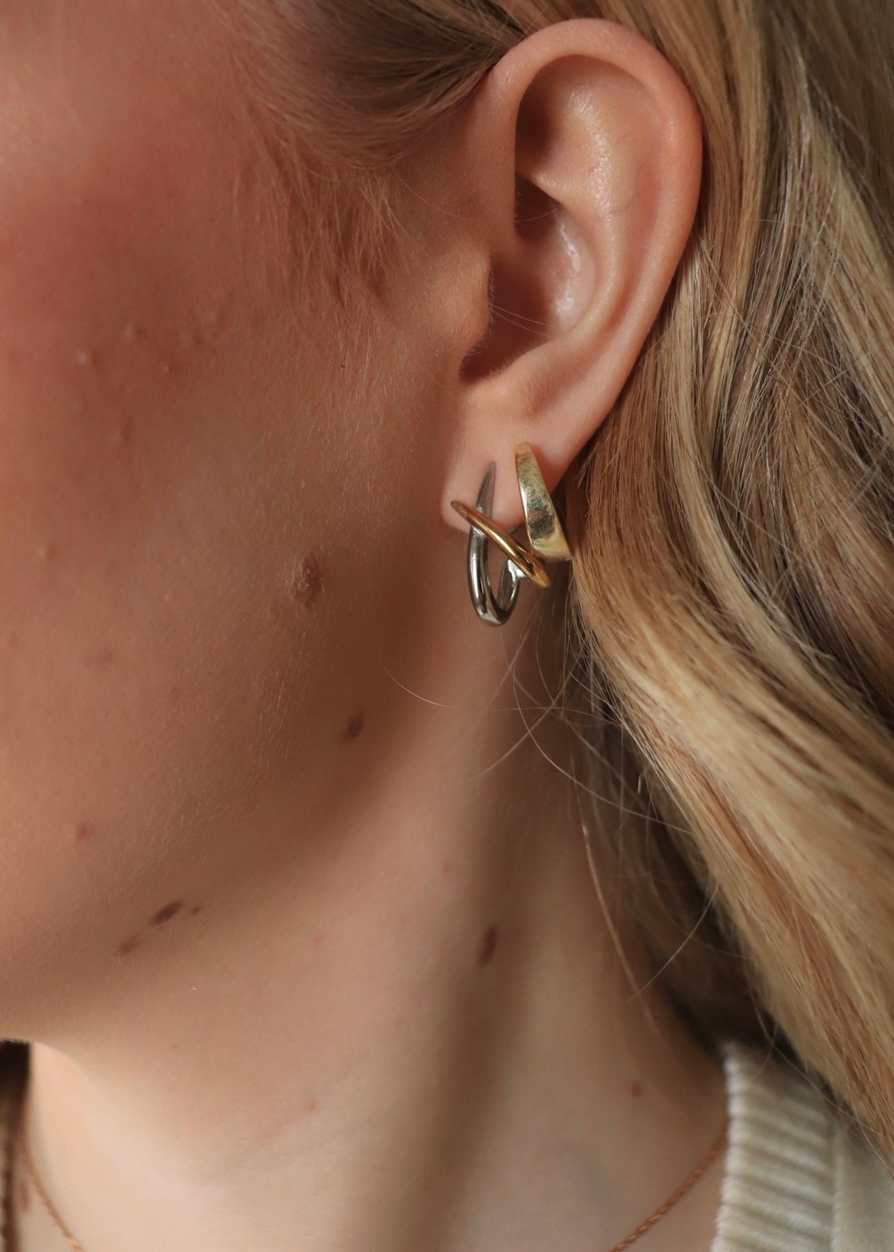 18K Gold Non-Tarnish Two Tone Crossover Earrings 18K Gold Plating Stainless Steel Measurement (L x W inch):0.8inx0.4in - Lead-free, Nickel-safe - Hypoallergenic - Water Resistant