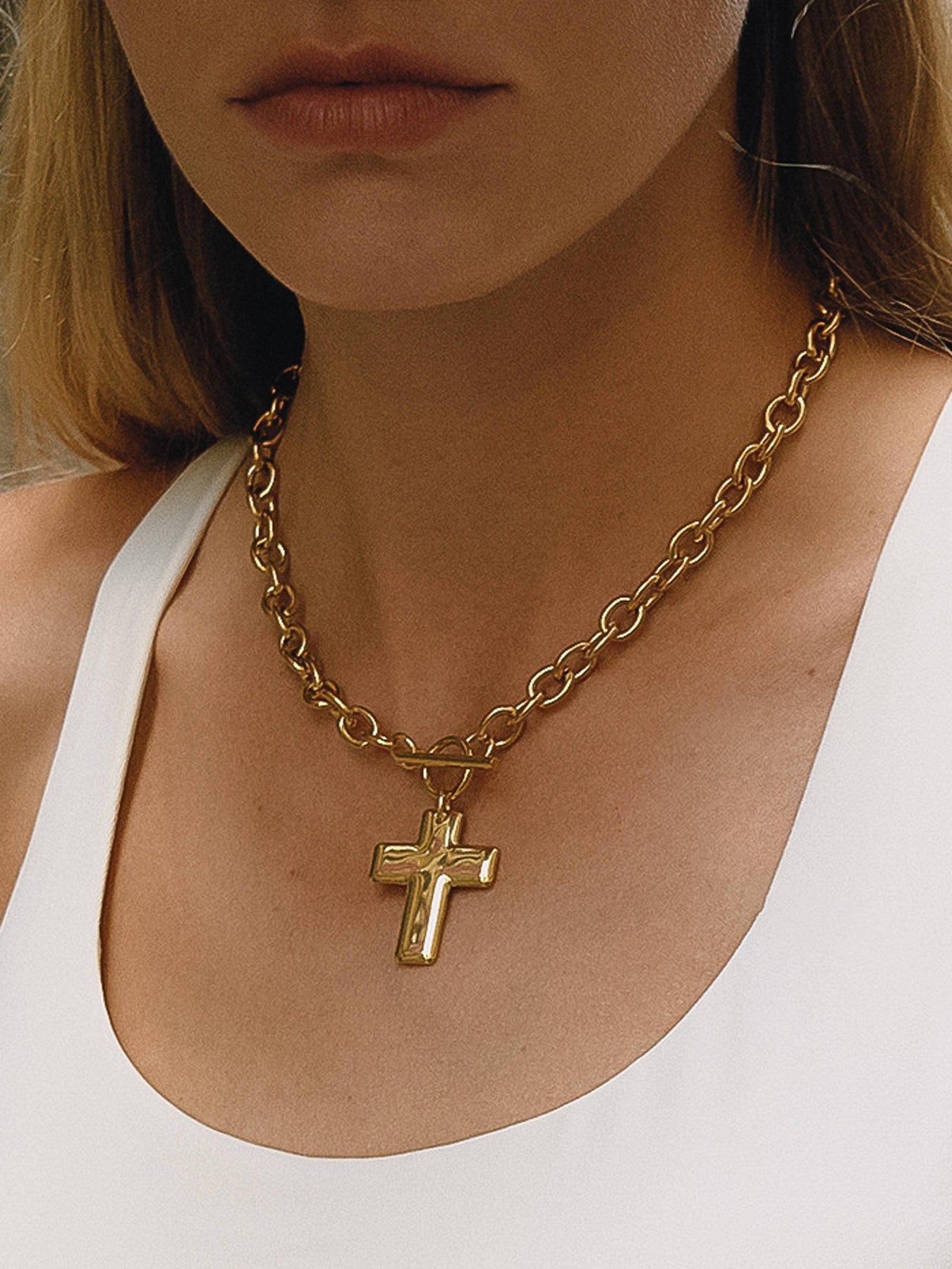 18K Gold Non-Tarnish Cross Pendant Necklace 8K Gold Plating Stainless Steel Pendant Size (inch): 1.26 Chain Length (inch): 16.53 - Lead-free, Nickel-safe - Hypoallergenic - Water Resistant