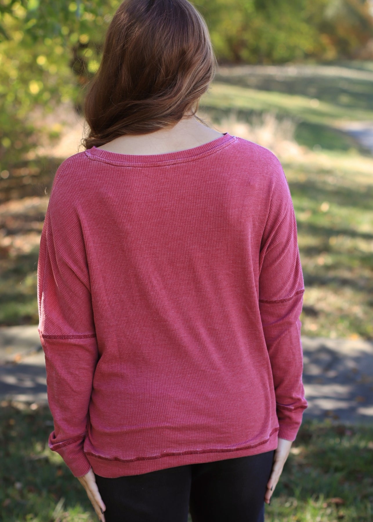 Garnet Red Waffle Ribbed Roundneck Pullover