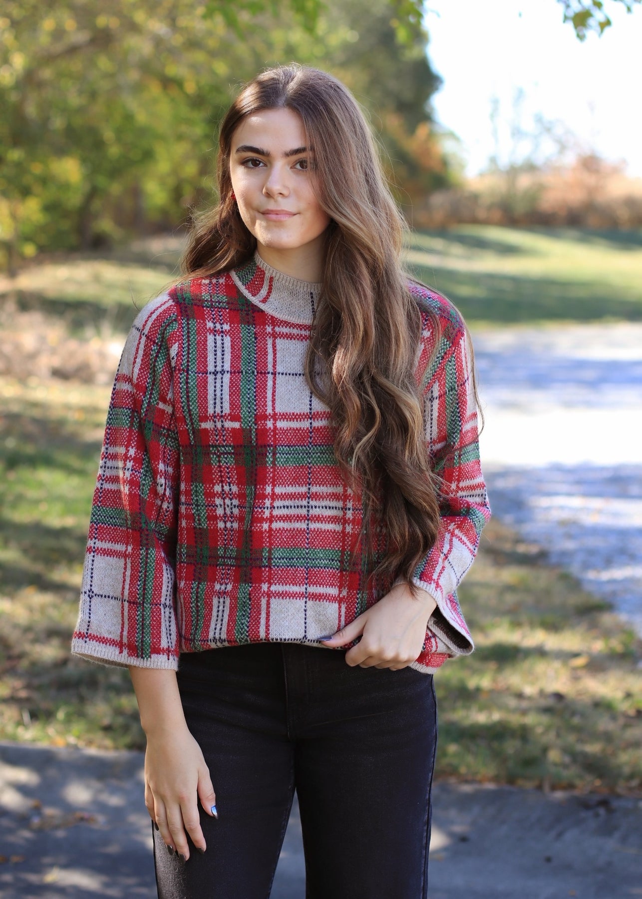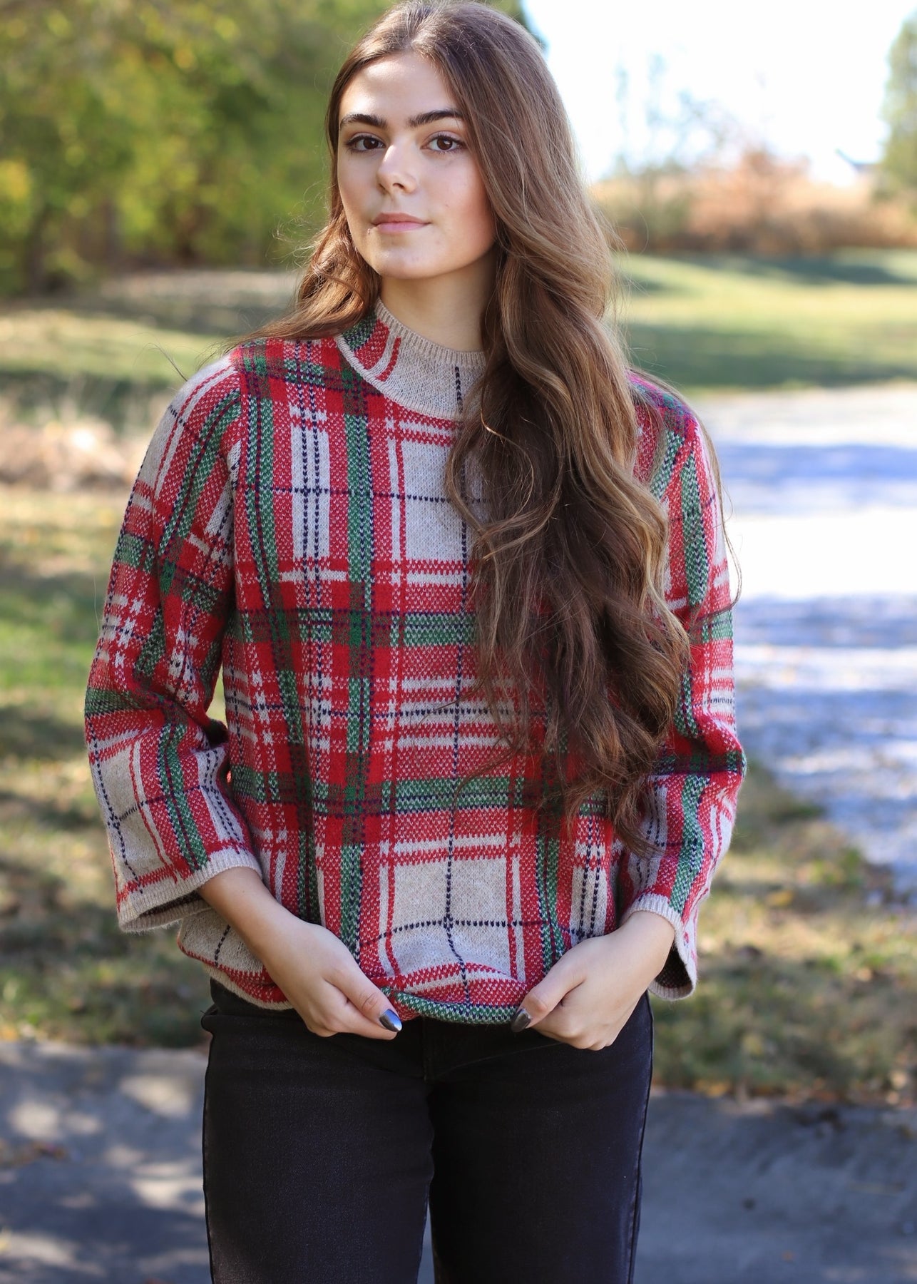 Bring cozy holiday charm to your wardrobe with our Holly Hearth Plaid Knit Top. The festive mix of red, taupe, and evergreen gives this soft knit a timeless Christmas feel — perfect for tree trimming, holiday markets, or fireside gatherings. With its relaxed fit and mock neck, it’s as comfortable as it is merry. Medium-weight, unlined, and non-sheer — your new go-to for effortless seasonal style.