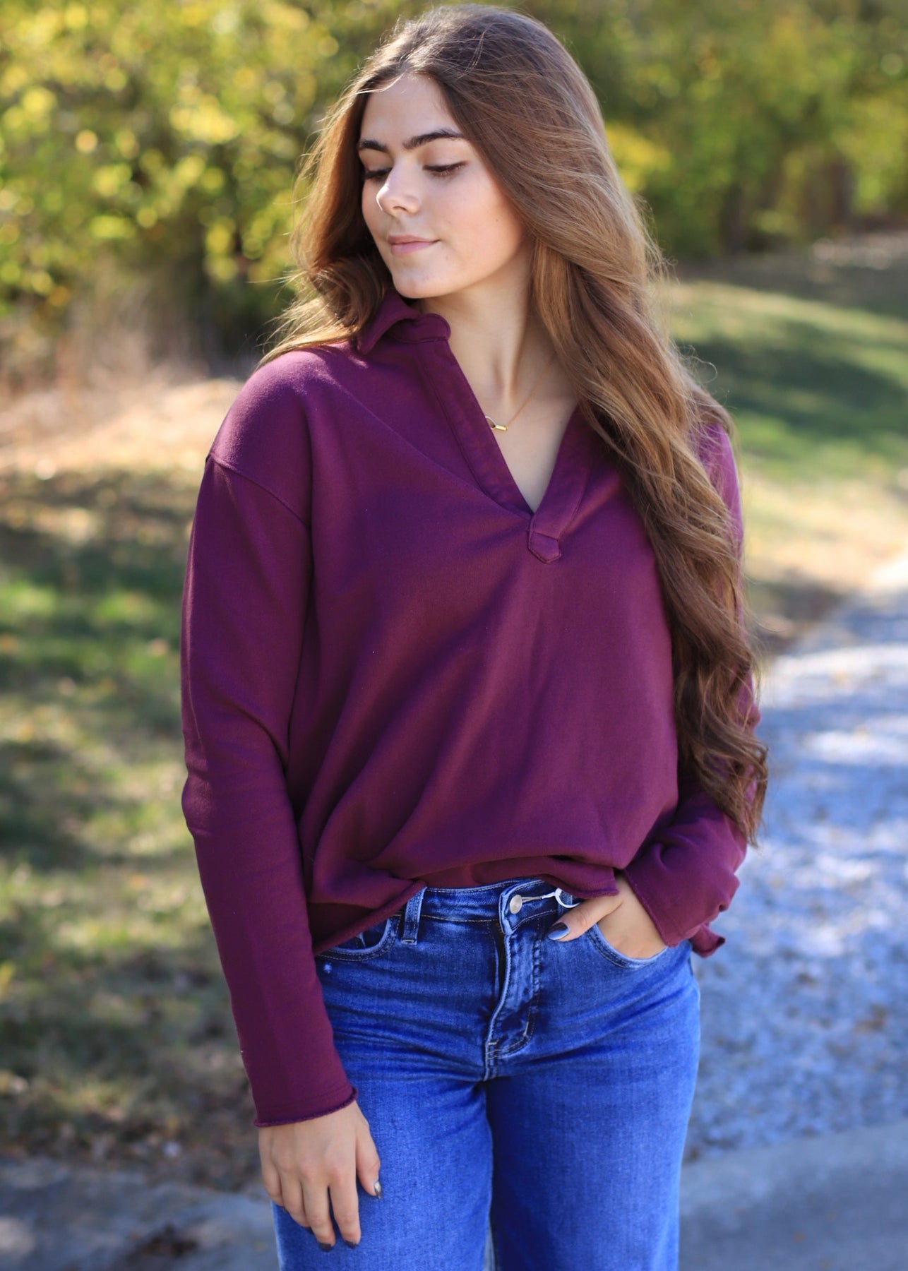Henley-style long sleeve with a V-neck and raw-edge hem for a vintage look. Perfect for brunch or lunch, this versatile tee pairs effortlessly with denim for a casual yet polished vibe! 100%cotton Model is 5'7" in a small