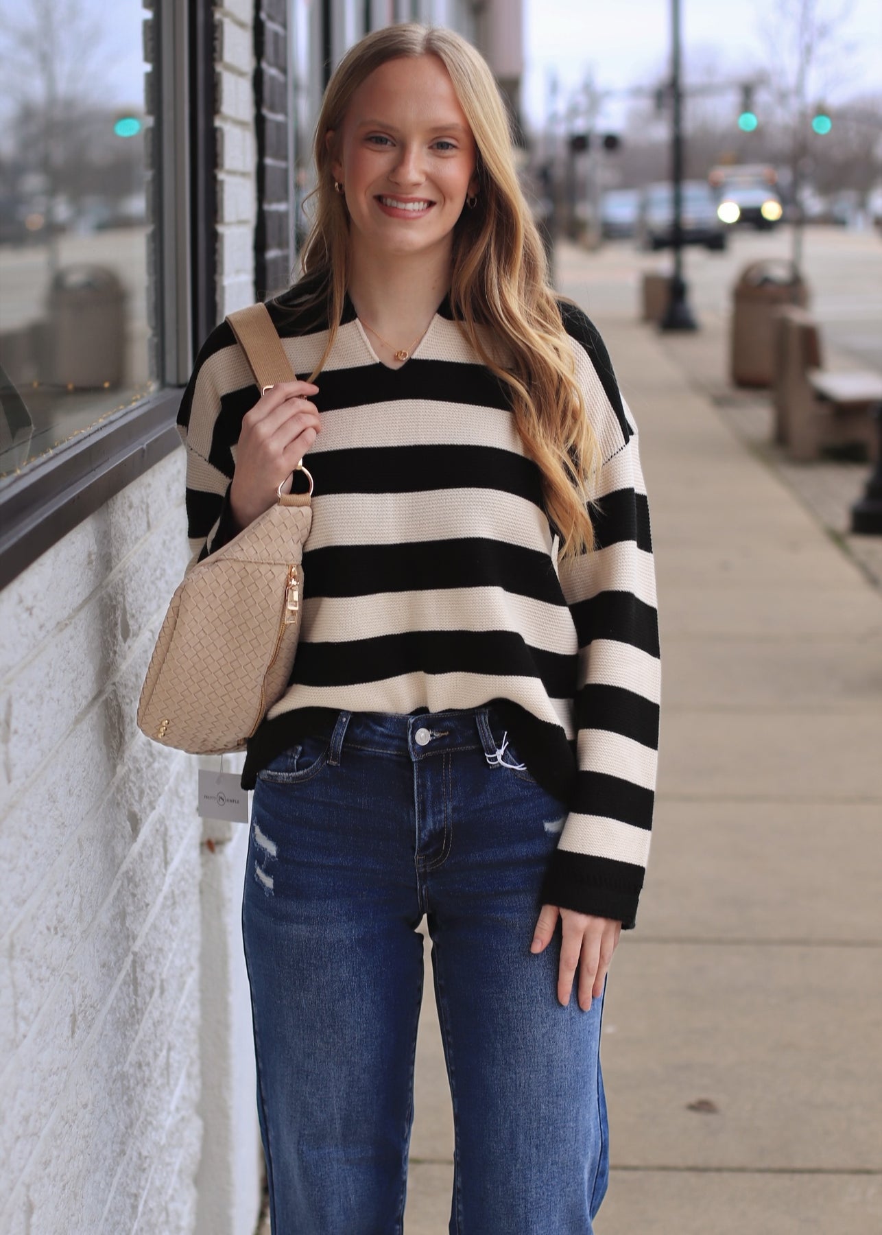This chic knit pullover features a bold horizontal striped pattern in alternating bands. Designed with a relaxed, slightly boxy fit, it includes a classic polo-style collar that opens into a casual V-neckline. The long sleeves are constructed with dropped shoulders for a slouchy aesthetic and are finished with wide, intricate open-knit cuffs that match the detailing on the straight hem.