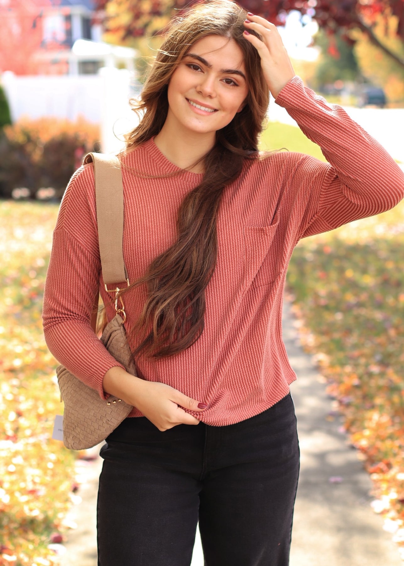 Start your day in effortless comfort with The Routine Top. This soft ribbed knit features long sleeves, front pockets, and a relaxed silhouette that’s made for movement (and coffee runs). The lightweight stretch fabric blend of polyester, rayon, and spandex keeps it cozy yet breathable—perfect for layering or lounging. Pair it with denim, leggings, or your favorite joggers for that “put-together without trying” look.