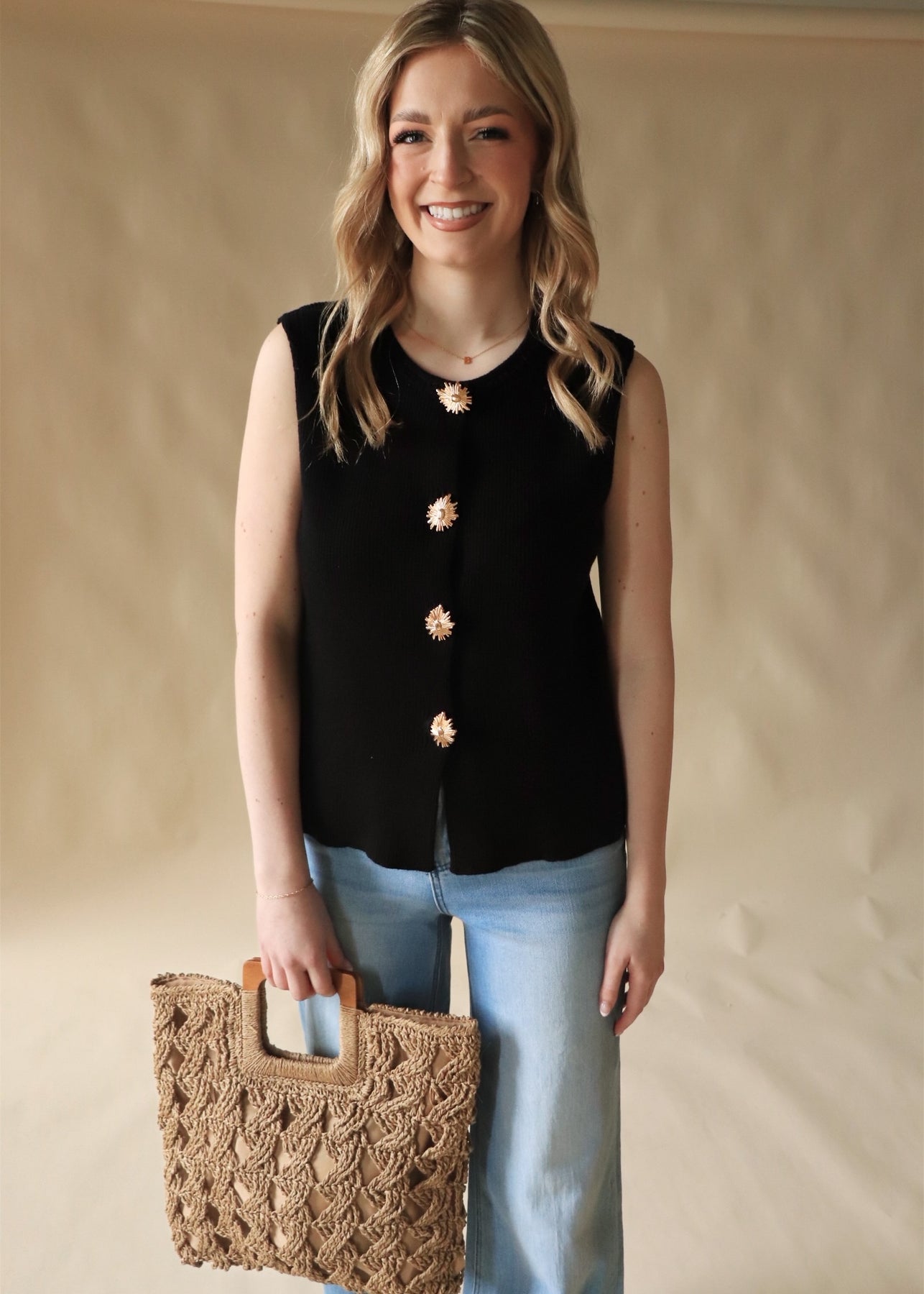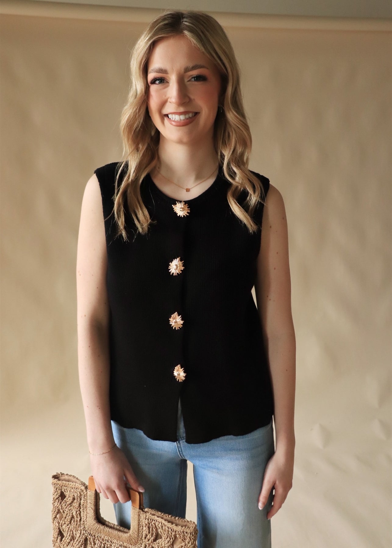 A soft ribbed knit tank featuring statement gold buttons and a flattering, structured fit. Polished enough for workdays, easy enough for everyday wear. Style it solo or layer it up—this one does it all.