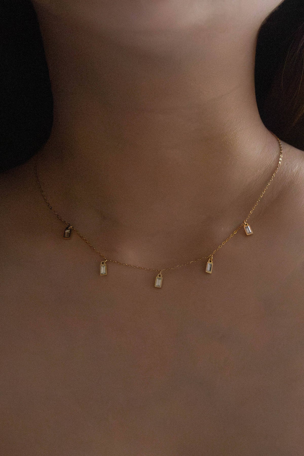 A delicate necklace in gold with dainty rectangular rhinestones! * Stainless Steel * 14k Gold Plating Measurement: * Length: 16in / 40.64cm * Extension: 2in / 5cm