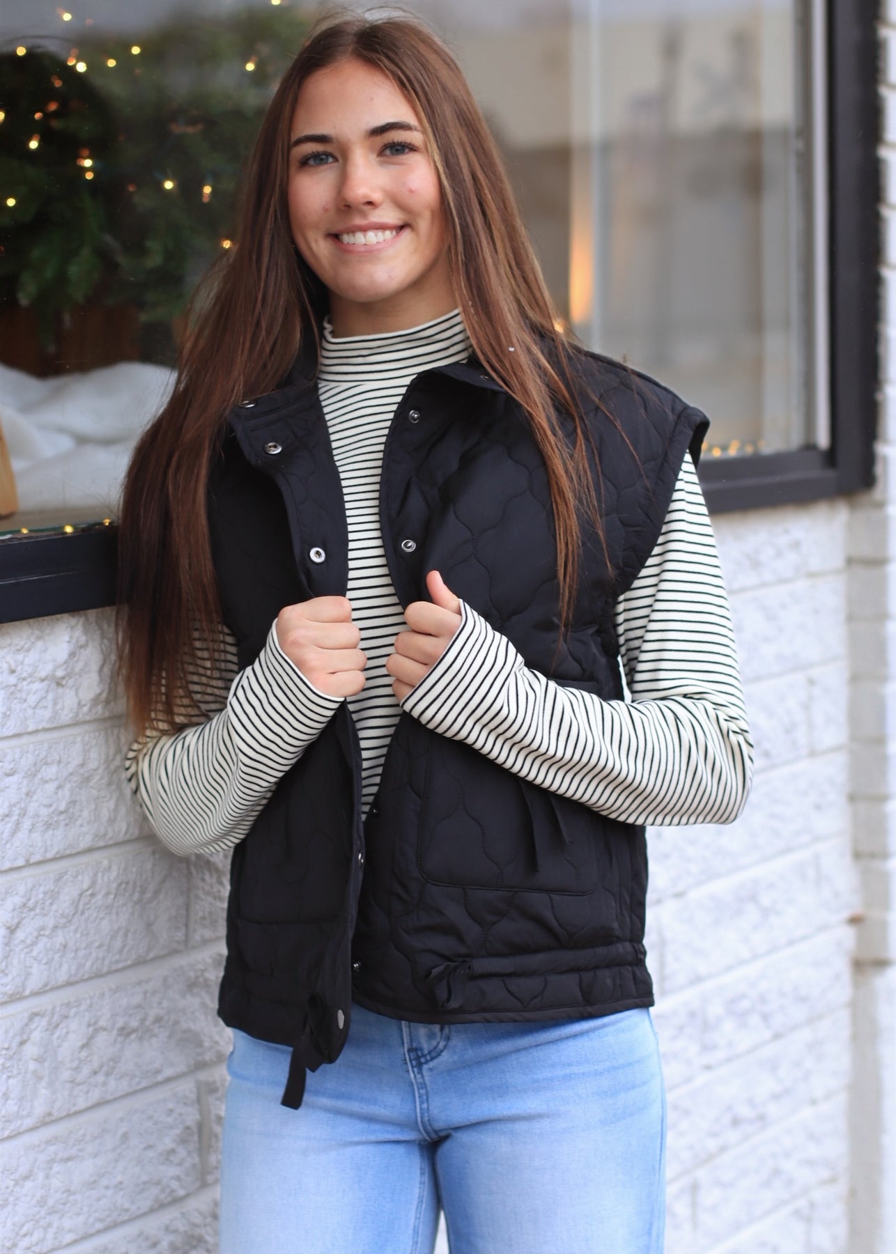 Elevate your everyday style with the Classic Cream Stripe Mock Neck Top. Designed in cream with timeless black stripes, this long-sleeve top features a relaxed, loose fit and a modern mock neckline. Made from a soft and stretchy fabric blend (95% polyester, 5% spandex), it’s perfect for layering or wearing on its own. A versatile striped staple that transitions seamlessly from casual days to chic nights.