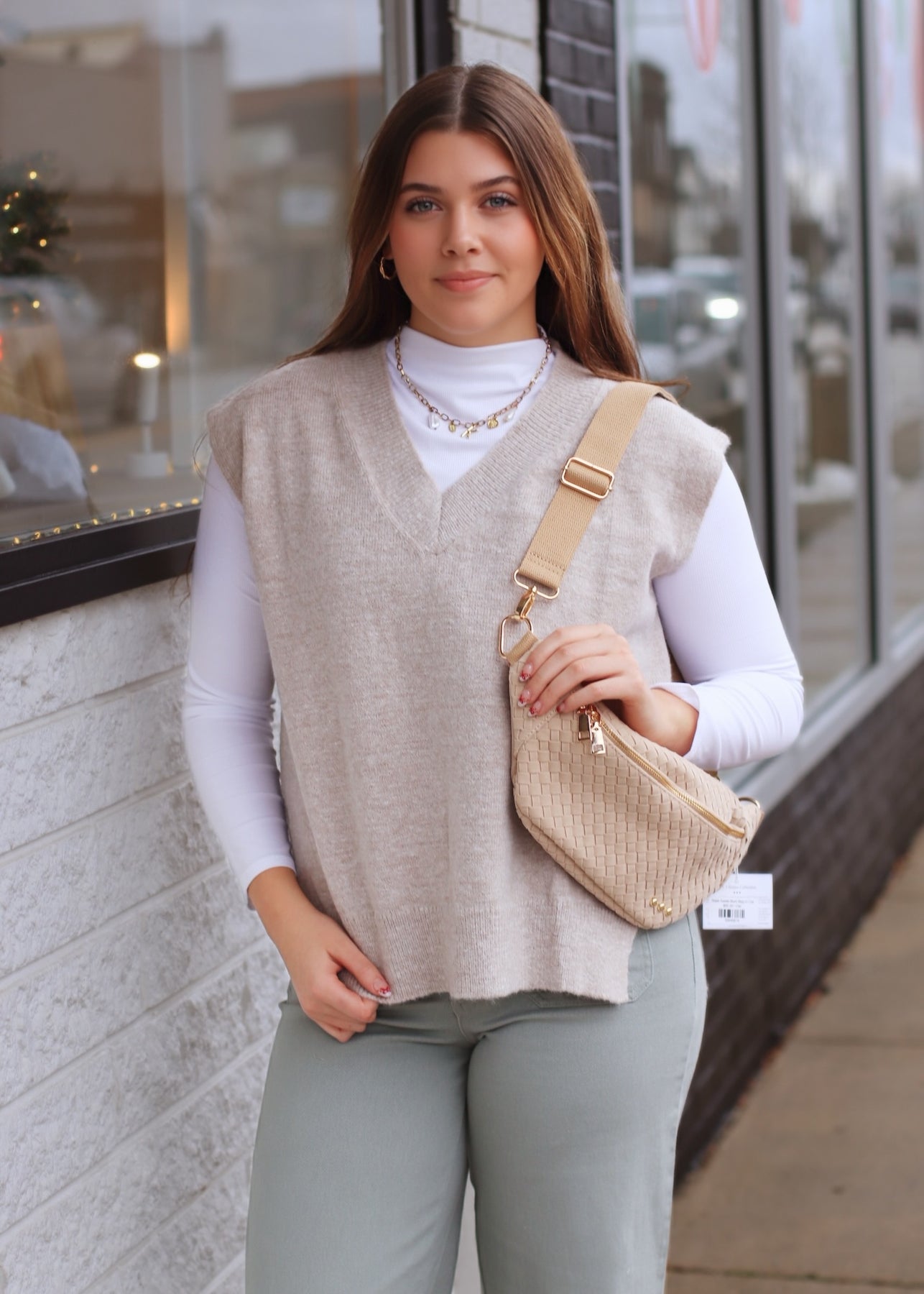 This sweater vest features a V-neckline, offering a classic and versatile look. The vest is designed with a ribbed neckline and hem, ensuring a snug fit and adding a textural contrast. This vest is a stylish choice for various occasions. Model is 5'6" in a small/medium.