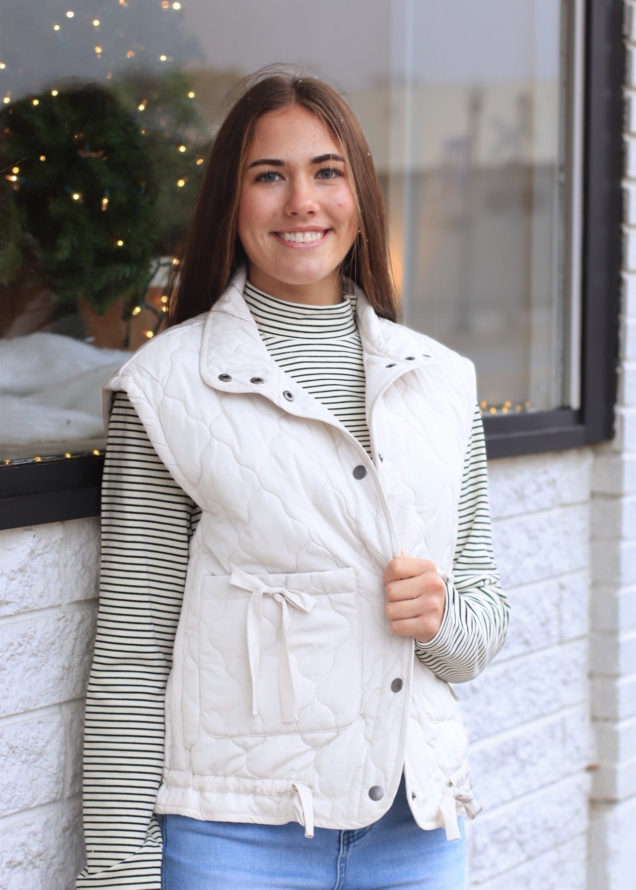 Stay stylishly warm with this quilted puffer vest, designed with a flattering tie detail at the waist and a mock necklinefor added coverage. The sleeveless design makes it perfect for layering over sweaters or hoodies, while snap button closures and functional pockets combine style with practicality. Crafted from 100% polyester (shell, lining, and filling), this vest is cozy, lightweight, and perfect for cool-weather adventures.