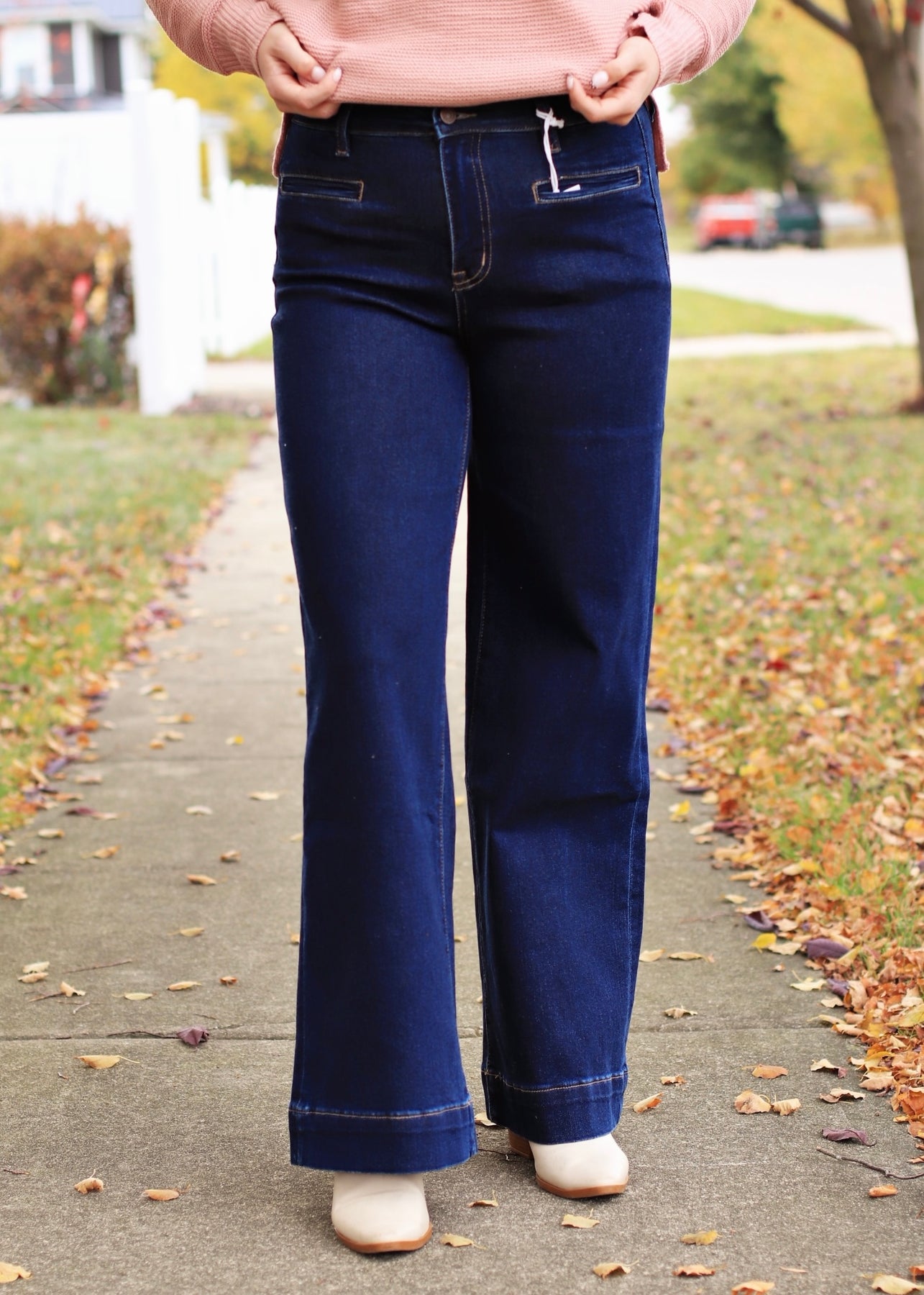 Sophisticated and effortlessly chic, The Kiera Wide Leg Trouser Jean blends tailored structure with modern comfort. Made from premium comfort stretch denim, these jeans feature a flattering high-rise waist and front welt pockets for a sleek, trouser-inspired finish. The dark wash and full-length wide leg create an elongated silhouette that transitions seamlessly from weekday polish to weekend ease. Finished with a clean trouser hem, this versatile pair is a timeless wardrobe essential.