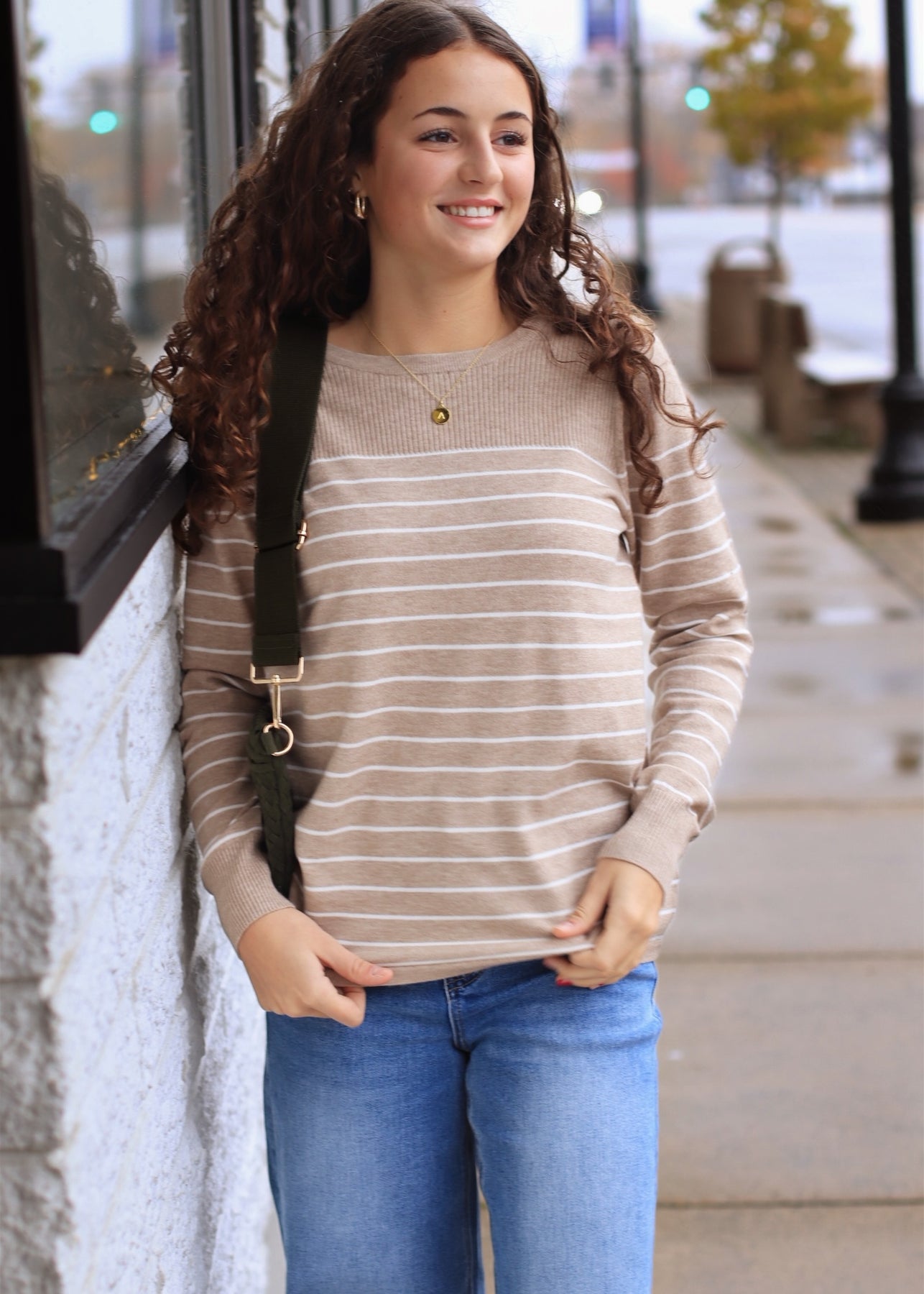 Soft taupe and cream stripes meet an ultra-soft, lightweight feel in the Stonehaven Sweater. With a classic crew neck and long sleeves, it’s effortlessly polished for everyday wear. 55% Viscose, 45% Nylon