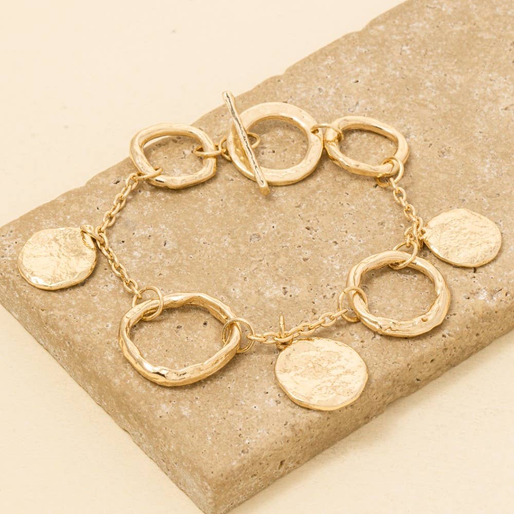 The perfect way to complete any outfit, this chain bracelet incorporates a remarkable warped hoop and coins design. Infuse your ensemble with a touch of sophistication using this versatile chain bracelet, a game-changer in the world of fashion. Available in GD, GDRH. This item is sold in packs of 1.