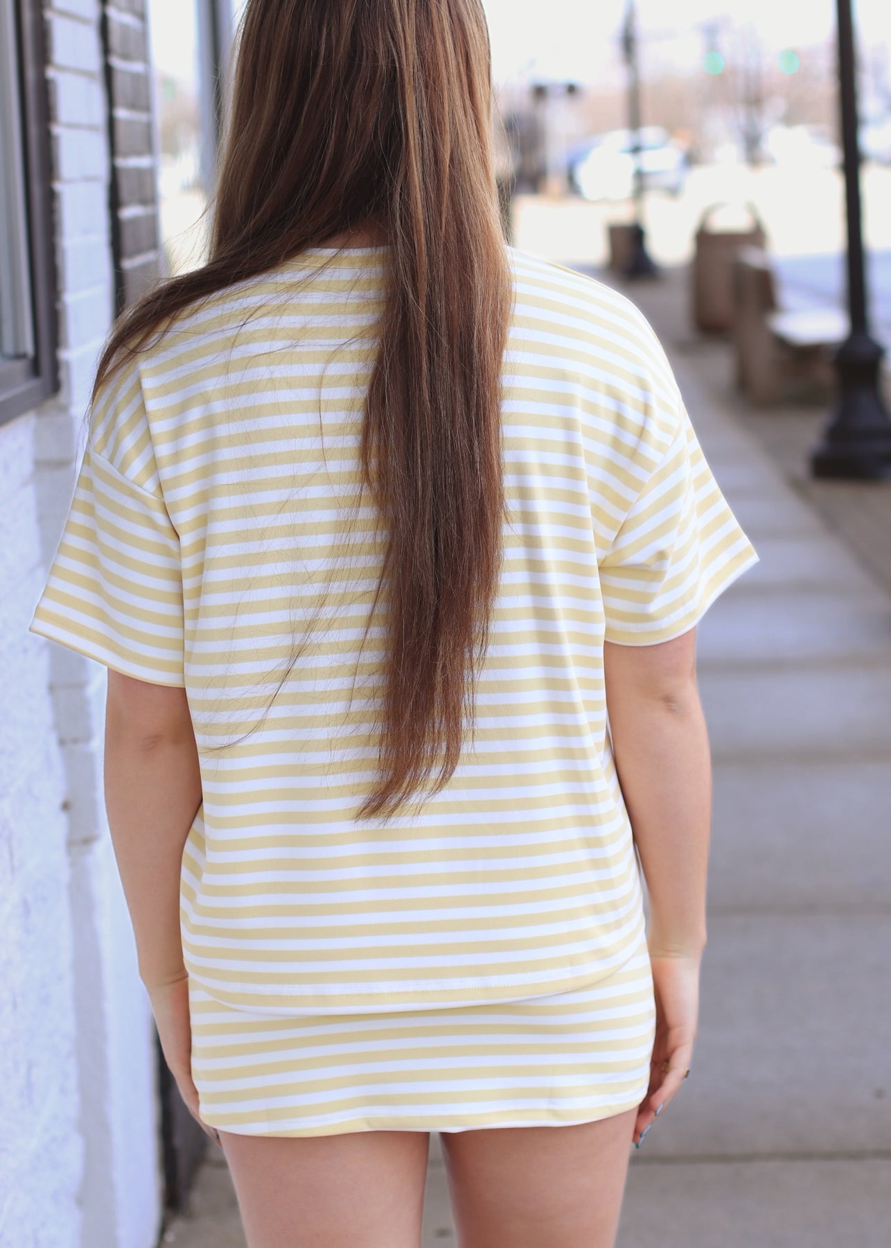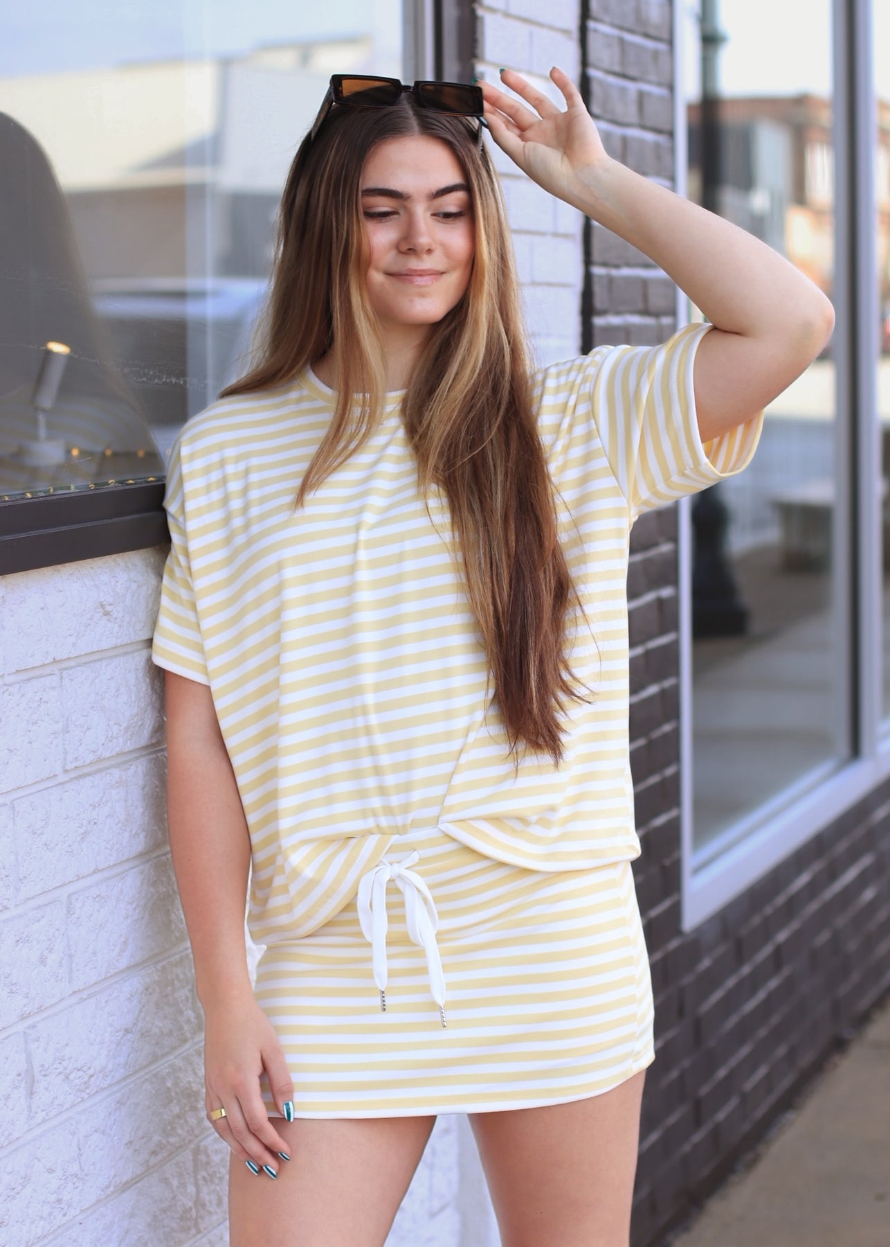 A comfy-meets-cute skort featuring classic butter-and-white stripes with a flattering, easy fit. Designed with a soft feel and built-in shorts for all-day confidence, this piece gives you the look of a skirt with the comfort you actually want. Dress it up with a tank or keep it casual with your favorite tee.