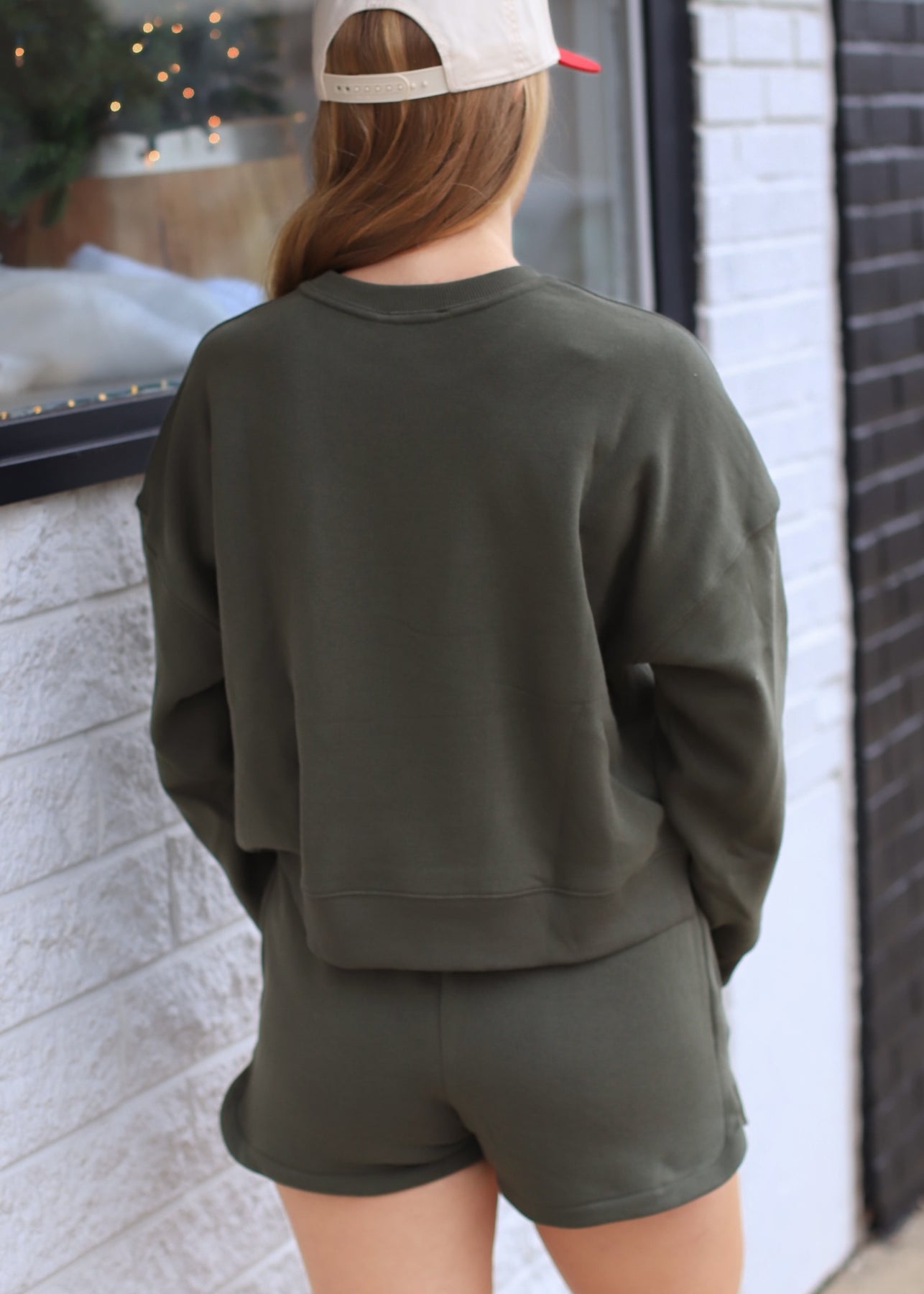 Your off-duty essential. These soft fleece dolphin shorts feature an elastic waistband with side pockets and a flattering curved hem. The dark olive color gives a cozy, elevated vibe that looks cute solo or paired with the matching sweatshirt.