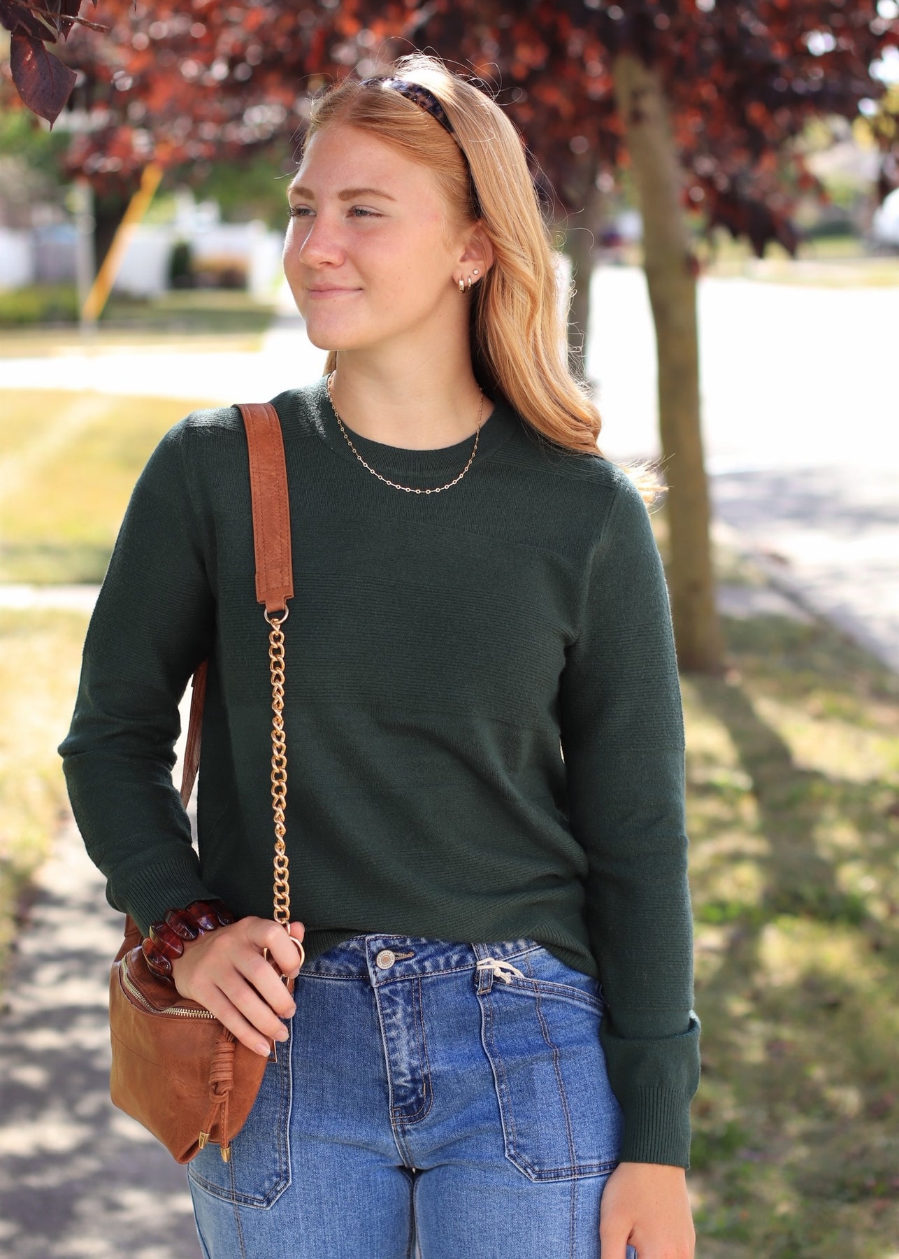 Stay effortlessly cozy with Evergreen. This forest-green pullover features long sleeves, a classic crew neck, and subtle textured stripes for added dimension. Soft, comfy, and easy to layer — a perfect go-to for everyday style. Available in sizes S–XL.