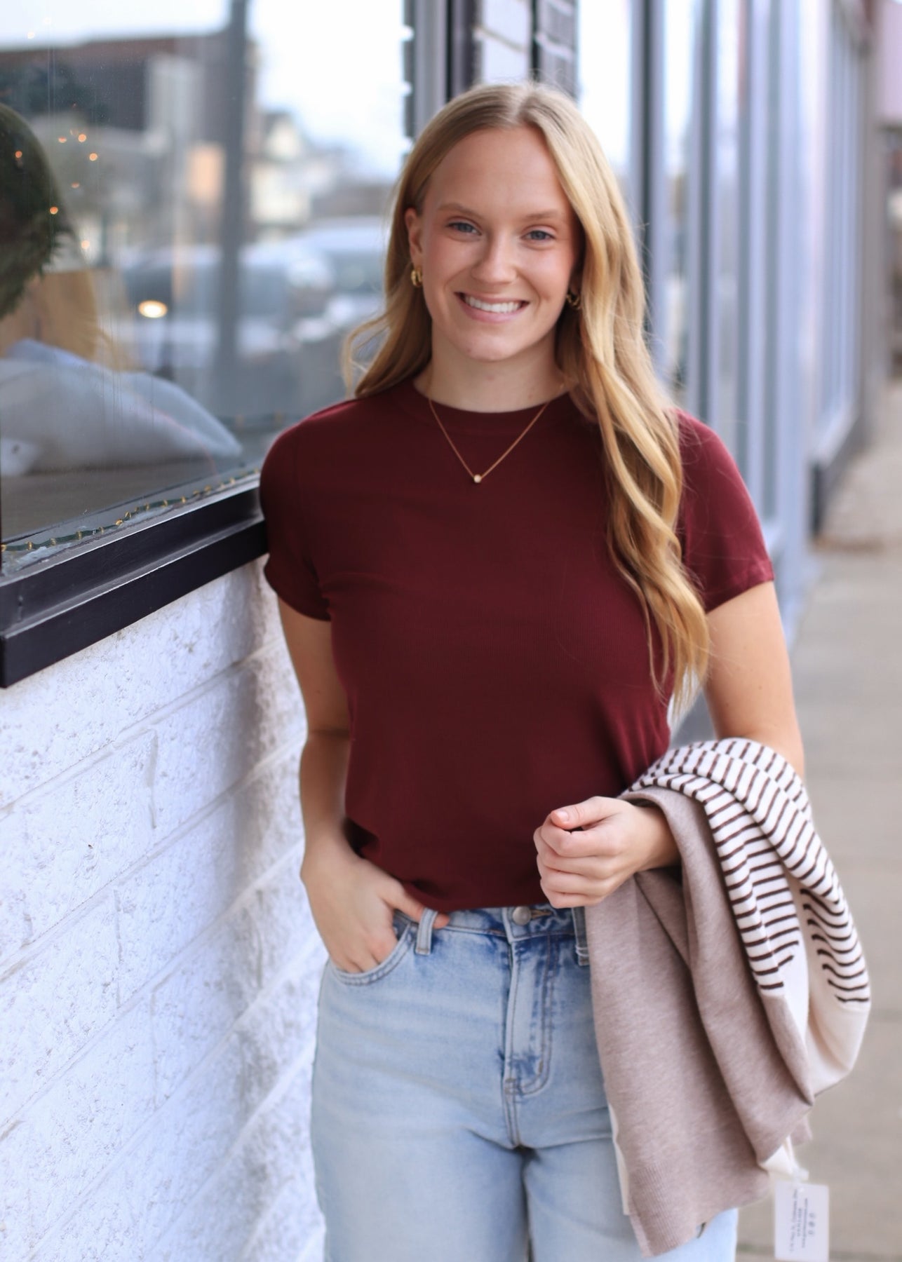 Your go-to everyday essential, the Softline Rib Tee combines comfort and style in one effortlessly chic piece. Made from a soft, stretchy blend of rayon, polyester, and spandex, its subtle ribbed texture adds dimension while the fitted silhouette keeps it flattering. Perfect for layering or wearing solo, it pairs seamlessly with everything in your wardrobe. Julia is 5'4" in a small.