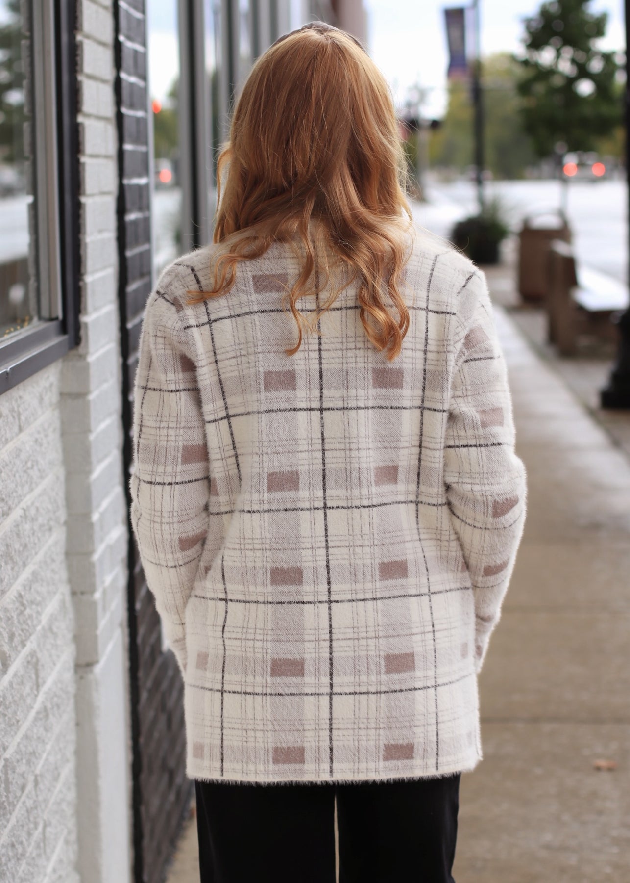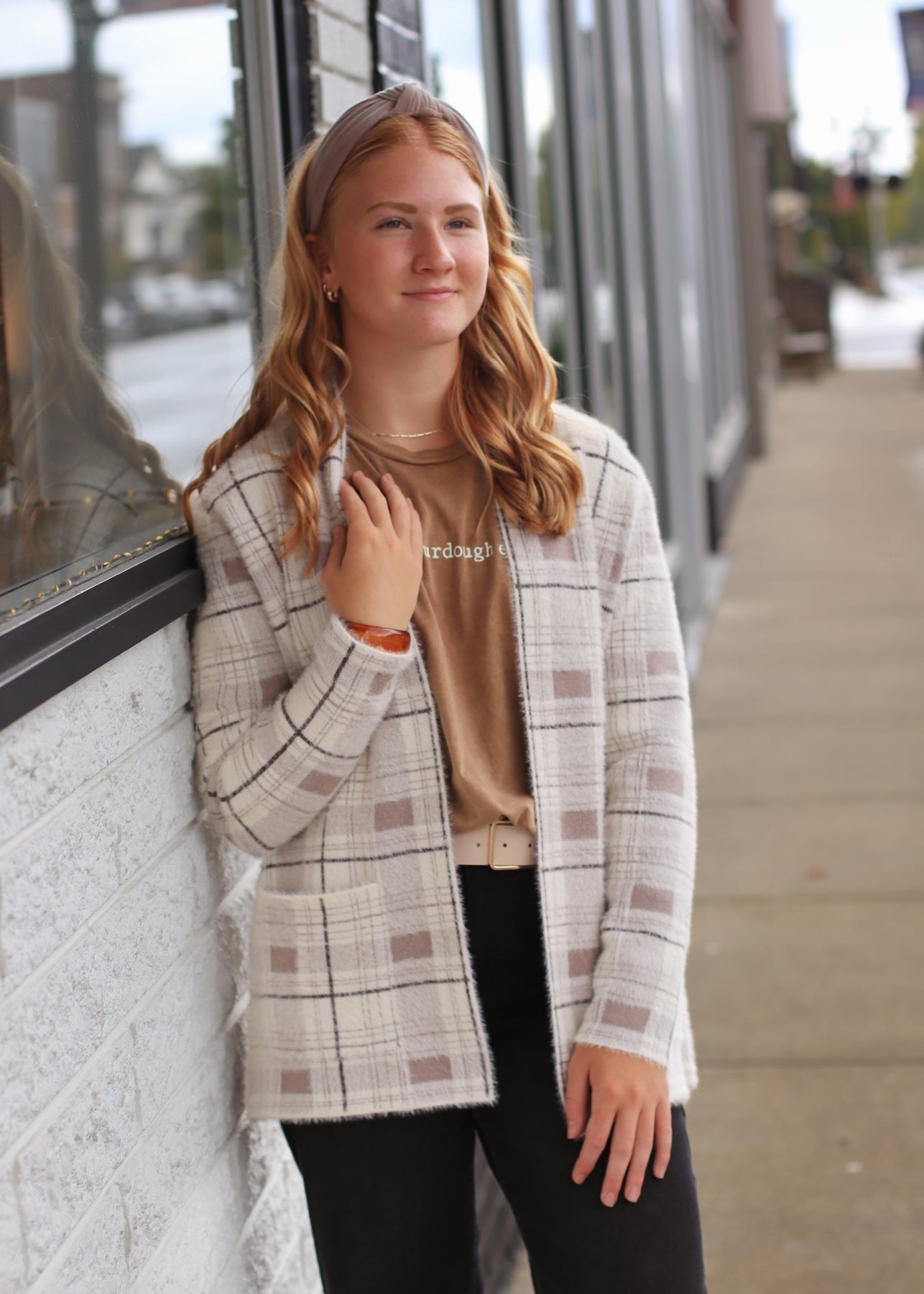 Meet your new layering favorite: Birch. This ivory and grey fuzzy cardigan features an open front, long sleeves, and cozy pockets, with a relaxed fit and classic check pattern that’s perfect for throwing over anything. Available in sizes S–XL.