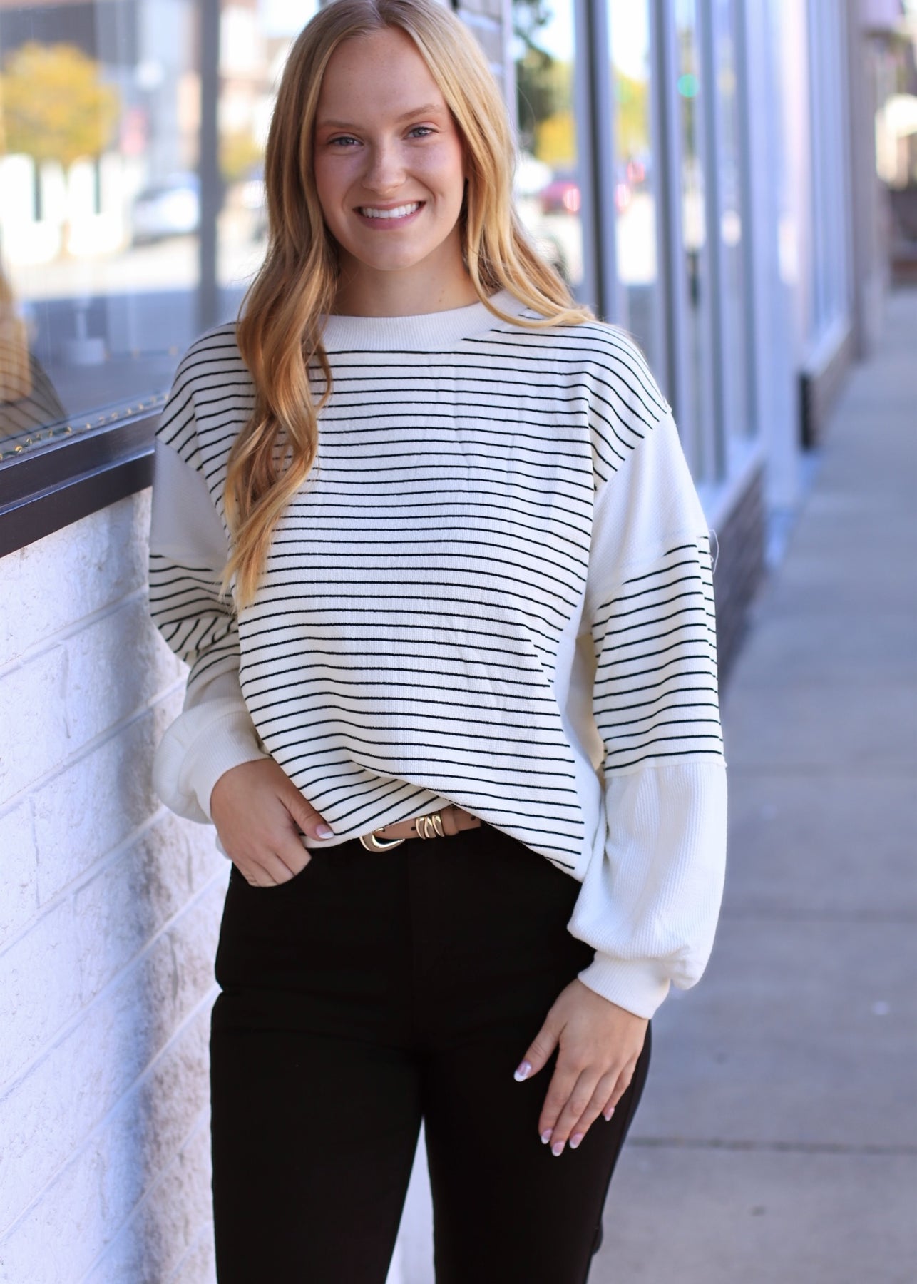 ROUND NECKLINE LONG SLEEVES DROP SHOULDER PATCHWORK CONTRAST DETAIL STRIPE PATTERN NOT LINED KNIT TOP SHELL: 95% POLYESTER, 5% SPANDEX CONTRAST: 95% POLYESTER, 5% SPANDEX
