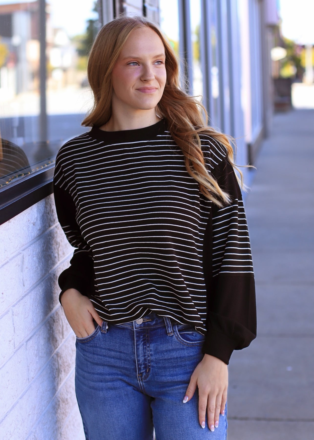 ROUND NECKLINE LONG SLEEVES DROP SHOULDER PATCHWORK CONTRAST DETAIL STRIPE PATTERN NOT LINED KNIT TOP SHELL: 95% POLYESTER, 5% SPANDEX CONTRAST: 95% POLYESTER, 5% SPANDEX